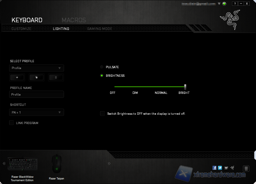 La seconda tendina dei driver, LIGHTING, è dedicato alla regolazione del LED logo Razer nella parte anteriore. Sono presenti 20 livelli di luminosità (si nota però la differenza per lo più nei primi), tale regolazione è possibile anche mediante tasti fisici, come visto nelle pagine precedenti.